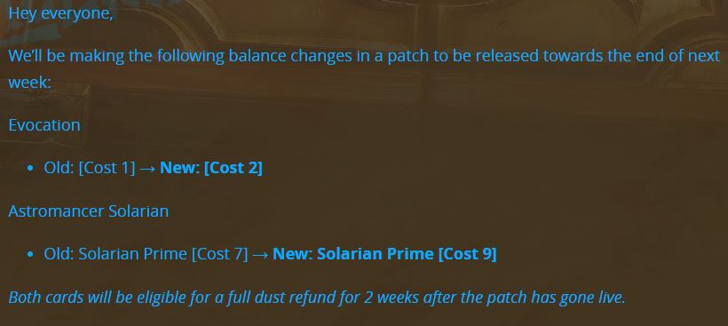 Title : Hearthstone On Twitter Changes Coming Next Week For Evocation Solarian Prime Source : twitter.com Open New Window