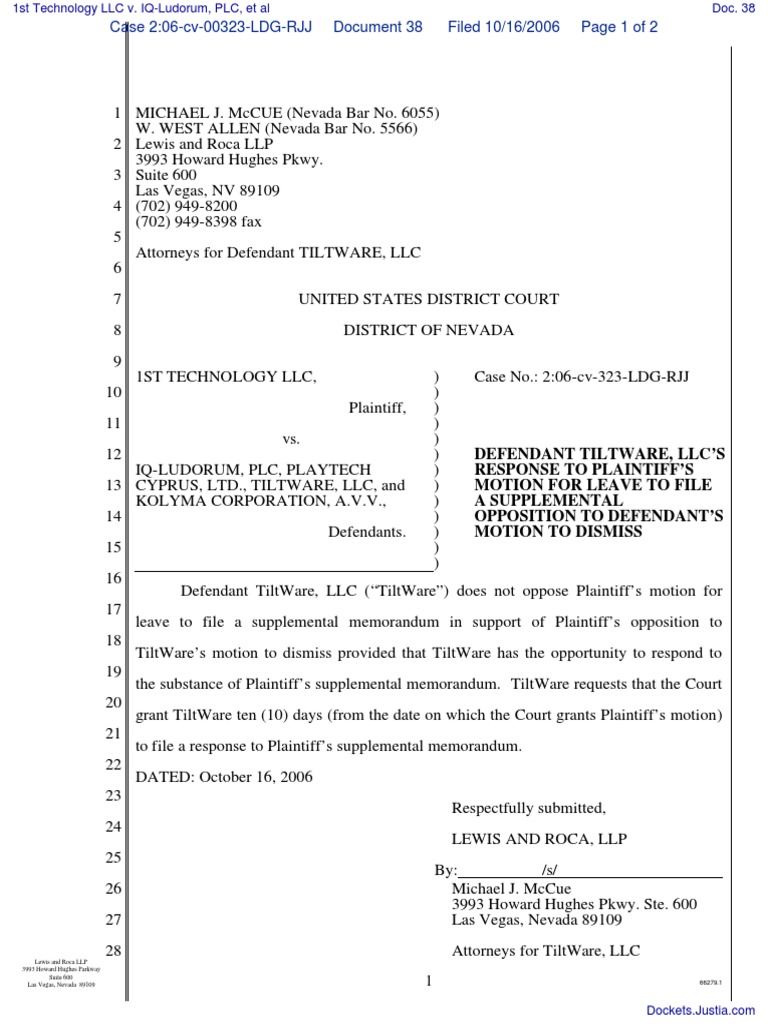 Title : 1st Technology Llc V Iq Ludorum Plc Et Al Document No 38 Nevada United States Law Source : www.scribd.com Open New Window