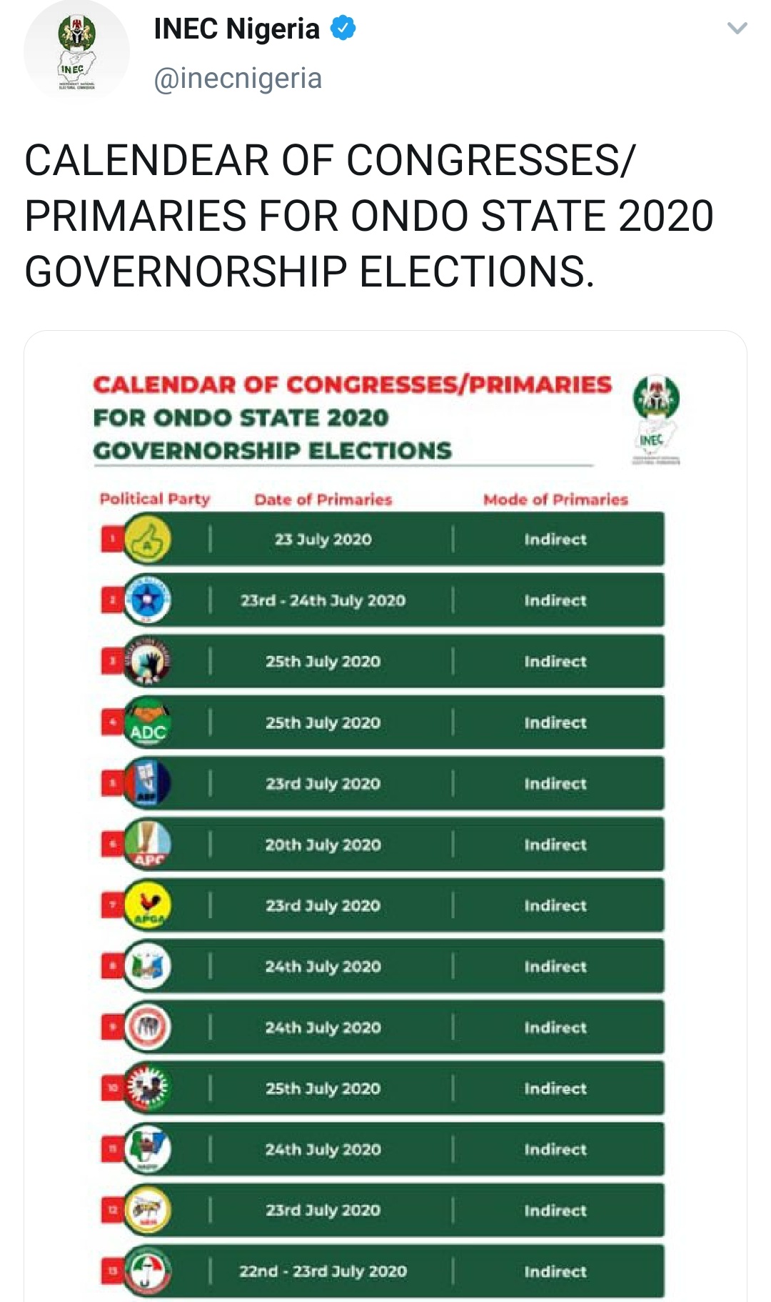 Title : Inec Nigeria On Twitter Calendear Of Congresses Primaries For Ondo State 2020 Governorship Elections Source : twitter.com Open New Window