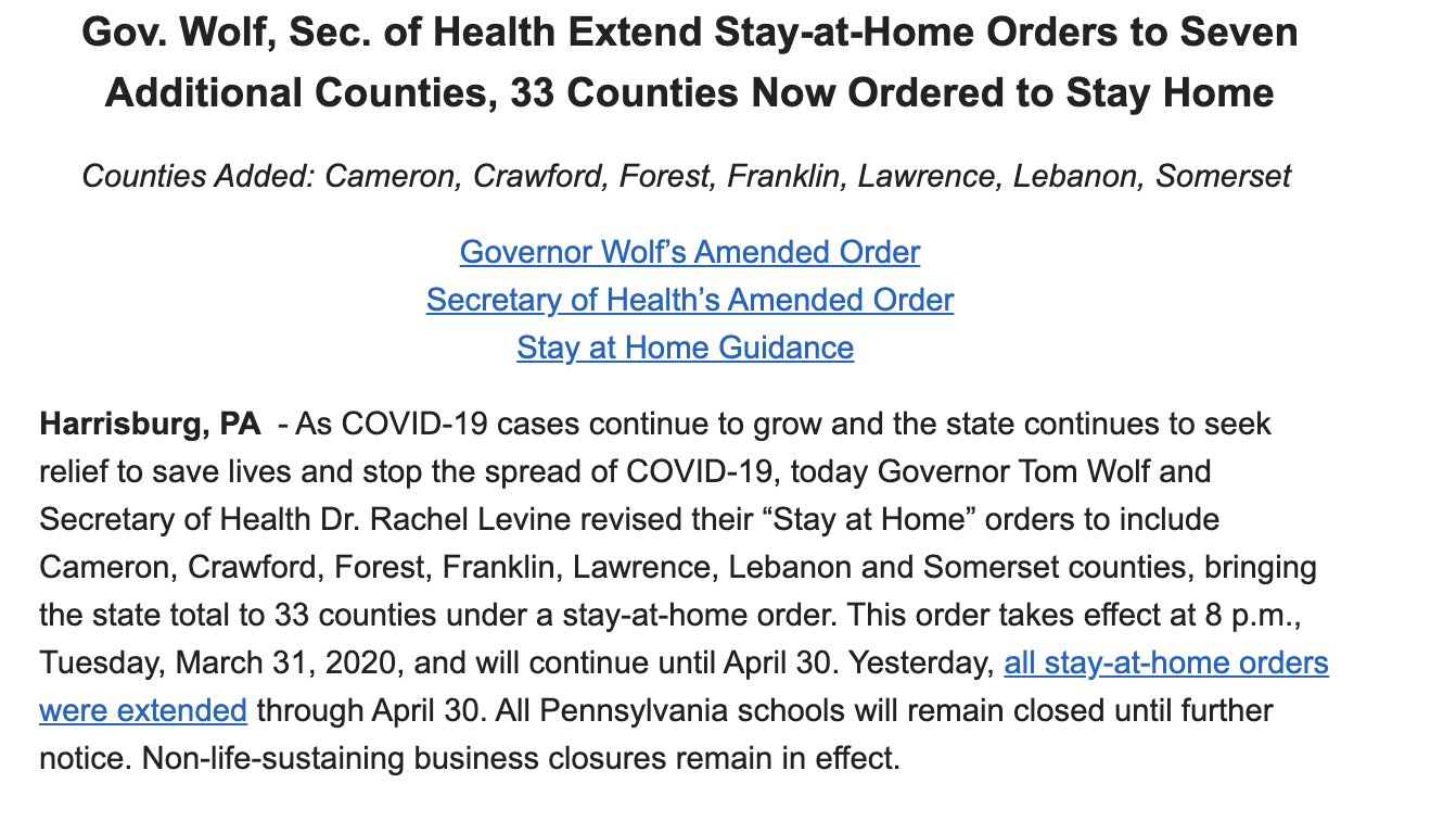 Title : Pennsylvania Capital Star On Twitter Governortomwolf Extends Stay At Home Order To Seven More Pa Counties Covid19 Source : twitter.com Open New Window