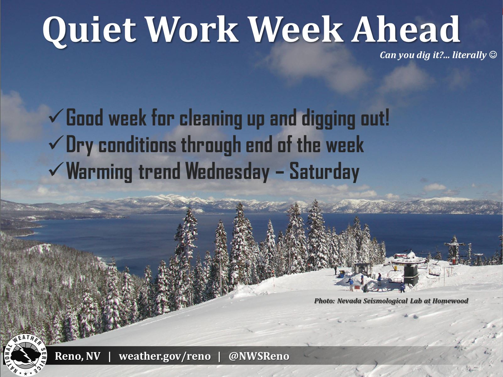 Title : Nws Reno On Twitter Quiet Week Ahead A Good Week For Cleaning Up And Digging Out Dry Conditions Thru End Of The Week A Warming Trend Starting Wednesday Https T Co Bc8hsz3bfs Source : twitter.com Open New Window