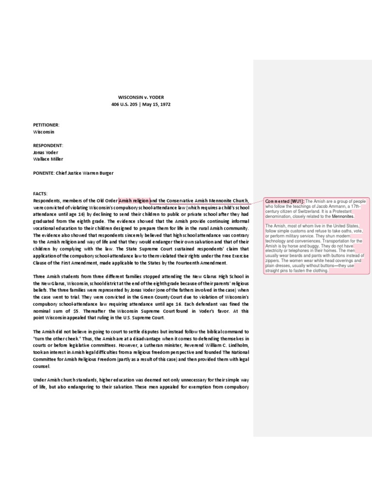 Title : Wisconsin V Yoder Case Digest Amish Free Exercise Clause Source : www.scribd.com Open New Window